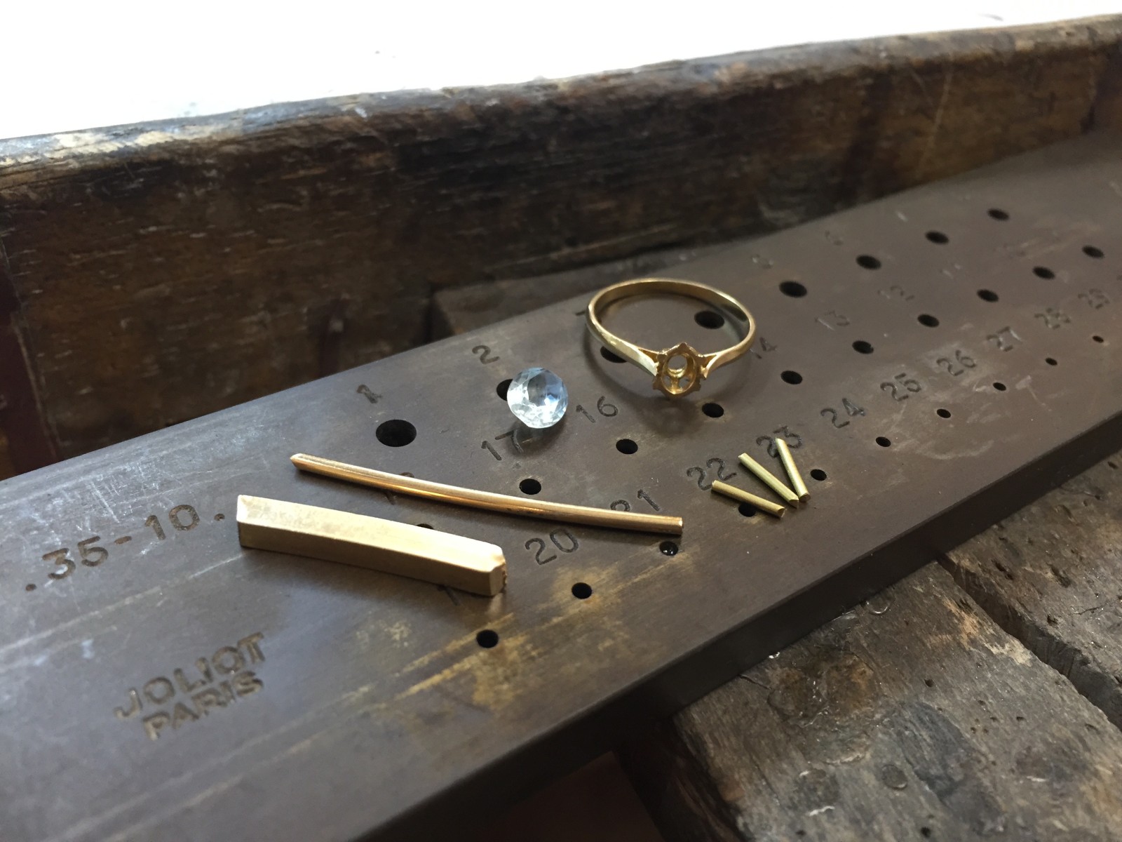 L'action de remettre des nouvelles griffes sur une bague débute avec un morceau de fil en or. Ce fil est travaillé à plusieurs reprises pour devenir plus en plus dur et résistant, en réduisant progressivement sa section par tréfilage et étirement. Cette étape est essentielle pour garantir la solidité des nouvelles griffes et leur capacité à maintenir correctement la pierre en toute sécurité.