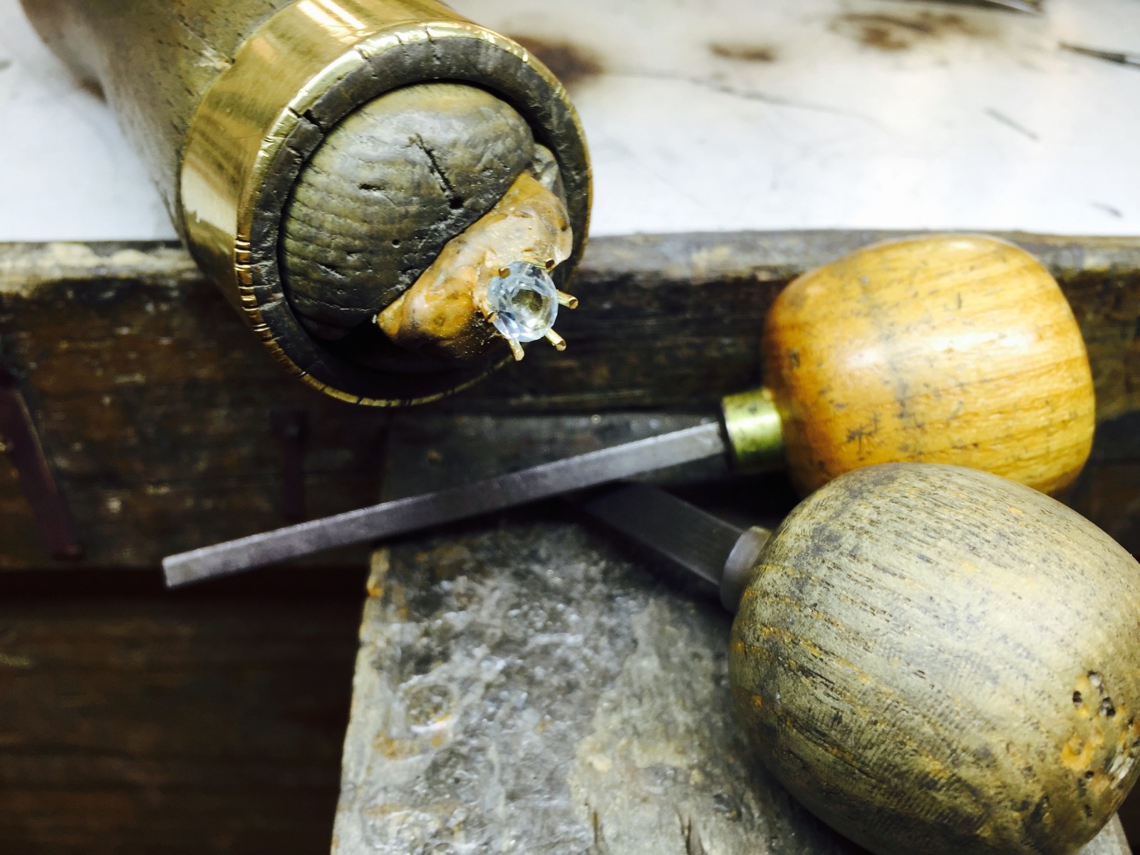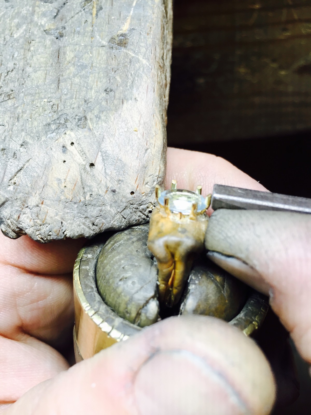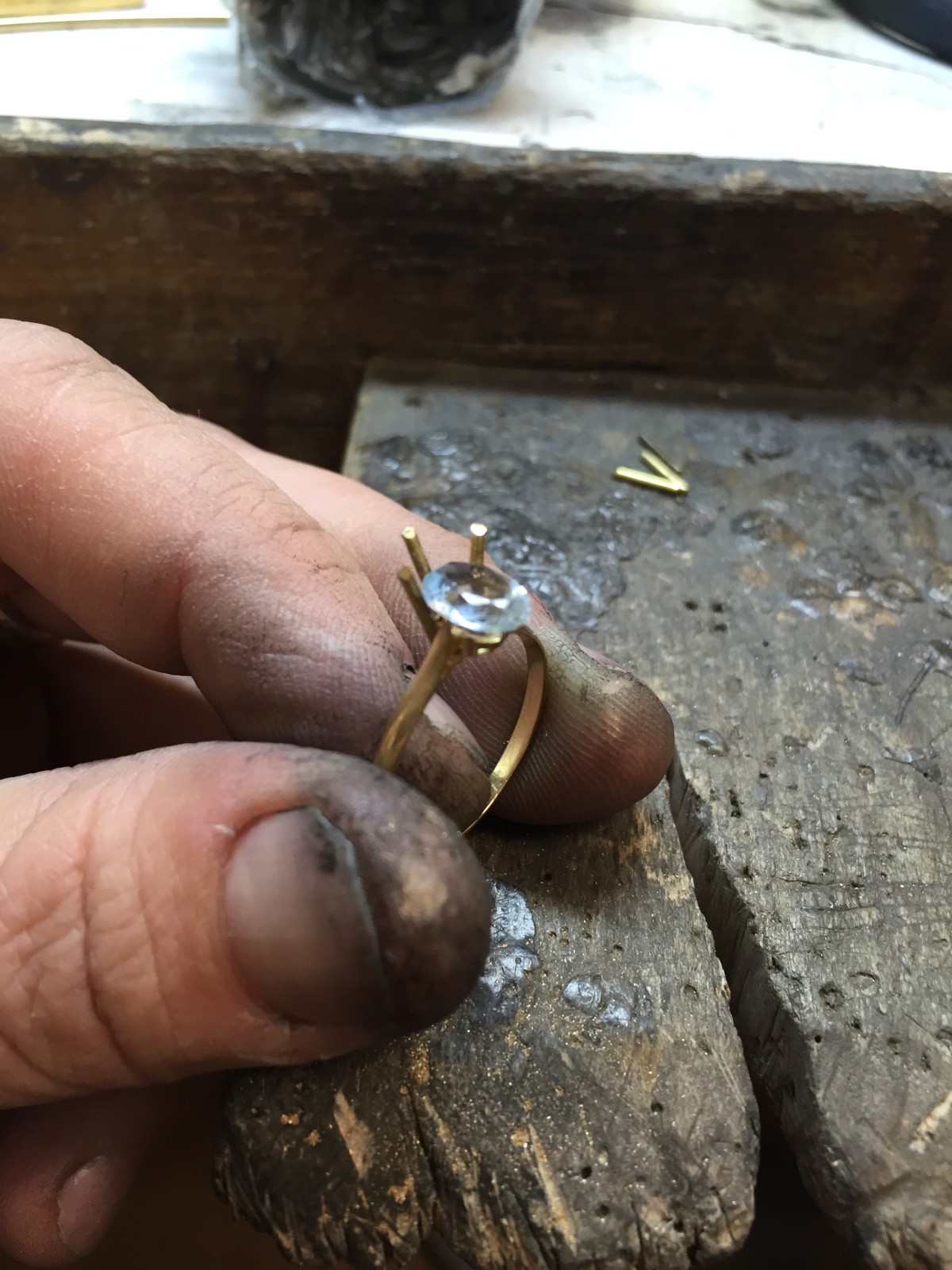 Une fois le fil préparé, Florentin Poyet prépare et positionne chaque griffe une à une. L'anneau qui regroupe toutes les griffes s'appelle la "ceinture", il faut être attentif et minutieux pour ajuster les griffes à la ceinture tout en respectant la forme de la pierre, pour ensuite souder les griffes au chalumeau.